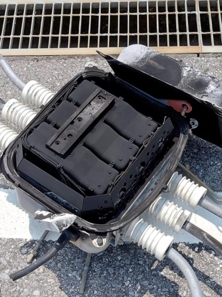 ↓今月の雷雨で実際に雷の落ちた高圧機器です。真っ黒焦げです。。
